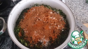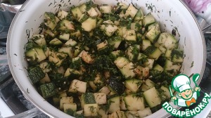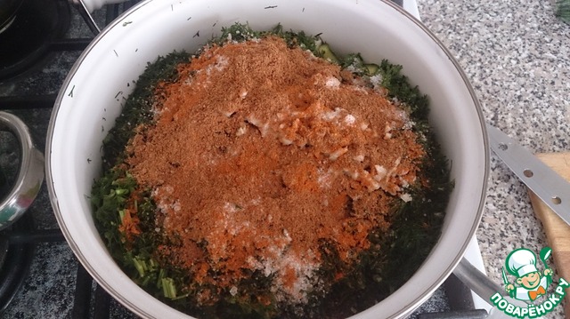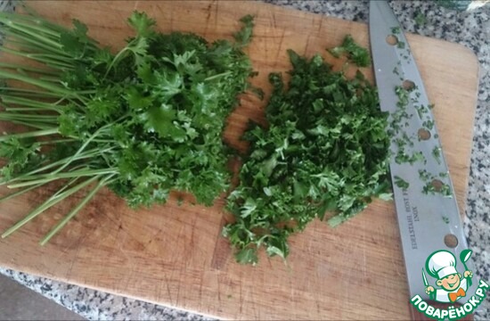 Зелень (мытая) измельчаем, кладем в чашу к кабачкам