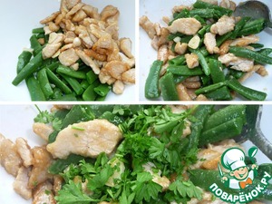 Готовила из куриного филе и замороженной фасоли. Не хотелось заморачиваться с ее отвариванием, поэтому просто обжарила минут 5 на топленом масле (не размораживая предварительно) и в конце добавила рубленый чеснок и соль-перец. А с мясом все по рецепту: крахмал сохраняет сочность, соевый соус обогащает вкус - прекрасное сочетание