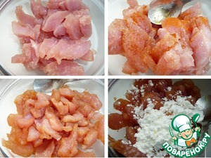 Филе индейки нарезать небольшими полосками, добавить немного соли, красного перца, специи для курицы, влить соевый соус, перемешать, оставить мариноваться на 30 мин.