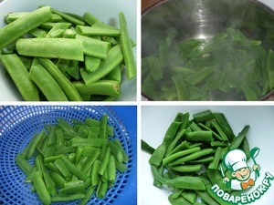 Стручковую фасоль помыть, нарезать на несколько частей, отварить в подсоленной воде до мягкого состояния, около 5-7 минут. Переложить в ледяную воду на 4-5 минут. Затем откинуть фасоль на дуршлаг.