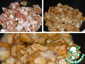 В казане или глубокой сковороде нагреть растительное масло, опустить мясо в кипящее масло, слегка обжарить, добавить чеснок, обжарить коротко, влить белое вино. Выпарить полностью.