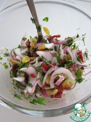 К зелени, острому перцу и изюму добавить лук вместе с маринадом и всё хорошенько перемешать.