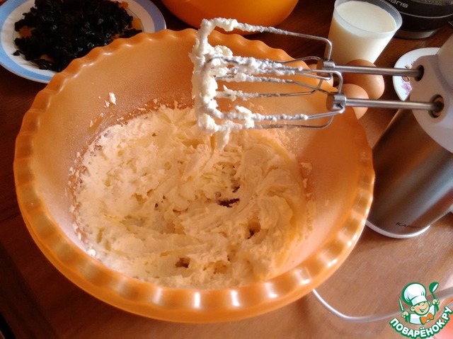 Чернослив вымыть, мелко нарезать. Цукаты нарезать маленькими кусочками. Если Вы решите использовать курагу её также необходимо вымыть и мелко нарезать. Размягченное сливочное масло взбить с сахарной пудрой.