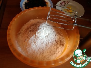 Добавить просеянную муку, разрыхлитель, перемешать с помощью миксера.