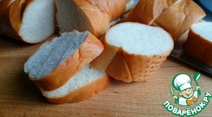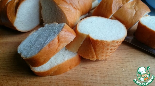 Хлеб нарезаем ломтиками толщиной примерно 3 см, а затем делаем посередине надрез, не доходя до конца.