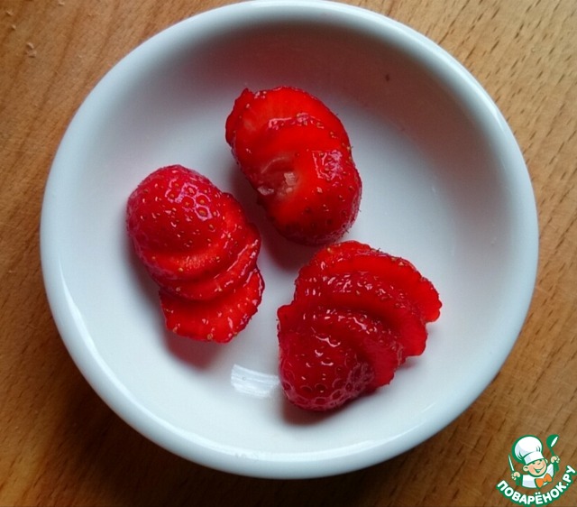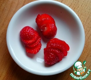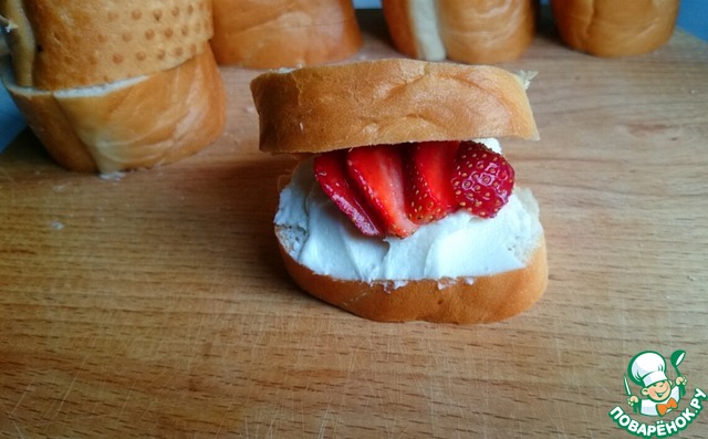 В хлебный "кармашек" помещаем чайную ложку сливочного сыра с сахаром и несколько ломтиков клубники.