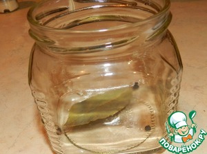 В чистую, стерилизованную баночку (у меня банка 0,390 мл.), на дно кладем 1 листик лаврушки и 3 горошины черного перца.