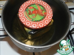 Закрываем банку крышкой, но не затягиваем, нам еще предстоит ее открывать, ставим в кастрюльку с водой комнатной температуры и медленно доводим до кипения.