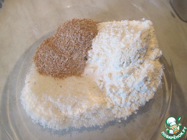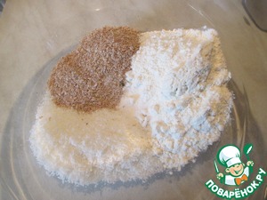 Смешиваем сухие ингредиенты: муку, отруби, сахар и кокосовую стружку.