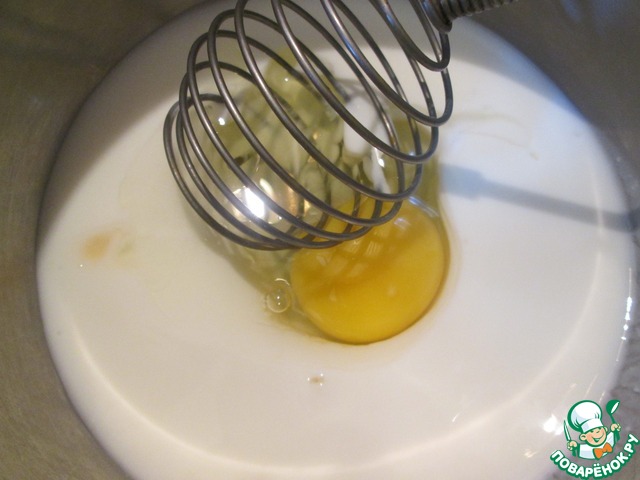 Венчиком взбиваем кефир с яйцом и ванильной эссенцией.
