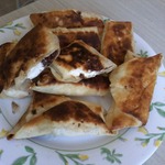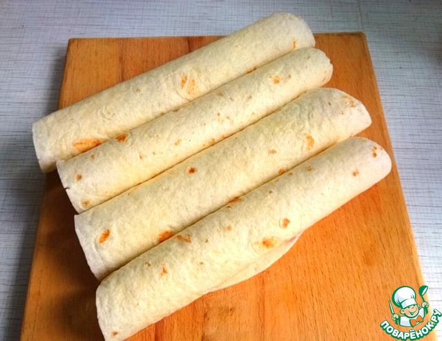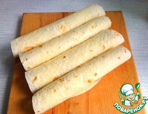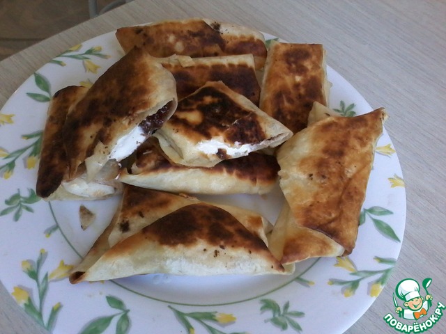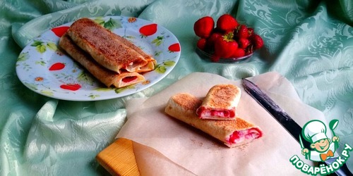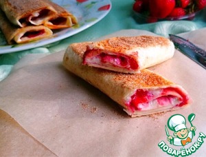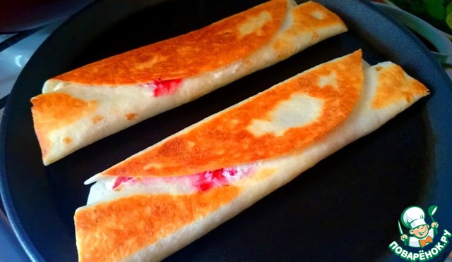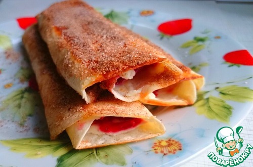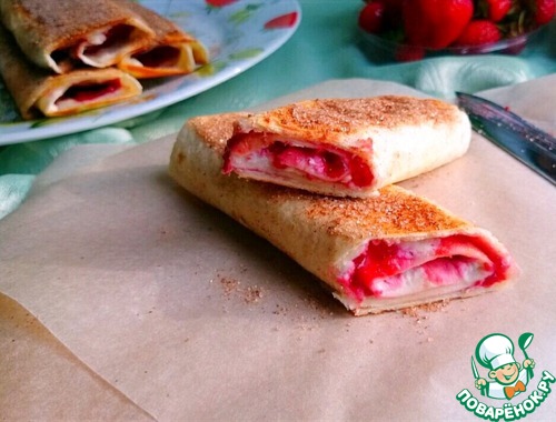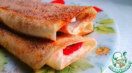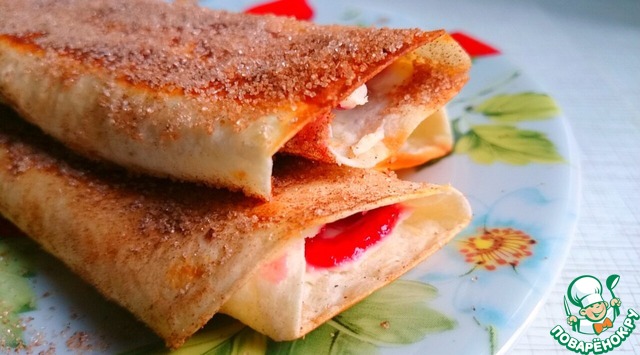 Я взяла сырые тортильи ( лепешки), приготовила на сухой сковороде, положила под полотенце, чтобы стали мягкими а потом все по рецепту. Только я вместо джема выловила ягоды из клубничного варенья ( один сделала с малиной - не вкусно), сыр - тертый моцарелла. Получилось очень вкусно! Только сахар я взяла коричневый, он не липнет, лучше брать белый или вообще без него.