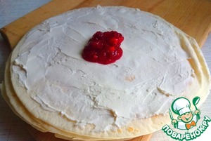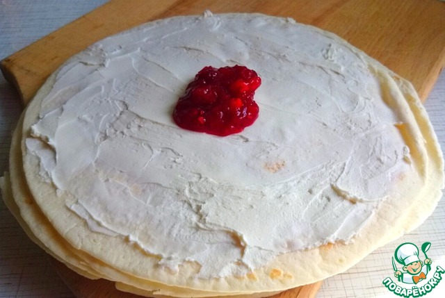 В этом рецепте использовались тортильи, но можно использовать и тонкий лаваш. Сначала каждая тортилья покрывается слоем сливочного сыра, а затем - слоем джема. На каждую тортилью, распределяем по одной столовой ложке сливочного сыра и по одной столовой ложке джема. Джем в данном рецепте используется клубничный, его сделала заранее следующим образом: клубнику засыпала сахаром, дала постоять, пока клубника не начнет выделяться сок, а затем на плиту - необходимо клубнику довести до кипения и добавить кукурузный крахмал, после чего перемешать и убрать с огня. Ягоды можно оставить целыми, а можно немного подавить или предварительно порезать на половинки-четвертинки. Можно добавить ванильный сахар или ванильную эссенцию.
