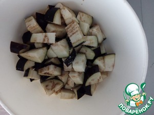 Баклажаны режем крупным кубиком, посыпаем солью. Через 30 минут когда они дадут сок, промываем холодной водой.