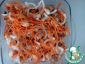 Голени и весь маринад, лук нарезанный полукольцами, морковь потертую на терке, баклажаны, выкладываем в форму для запекания. Добавляем масло и запекаем при температуре 200 градусов 20 минут.