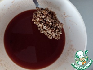 Томат разбавляем водой и всыпаем промытую гречку. Солим и перемешиваем.