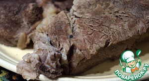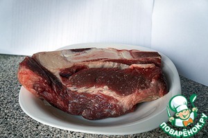 Сварить мясной бульон. Вот такую грудинку залить холодной водой, довести до кипения, снять пену, убавить огонь до среднего, бросить коренья и варить до готовности мяса 2,5 часа. Посолить минут за 30 до готовности.