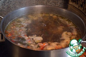 Бульон довести до кипения, отправить в него картофель, дать закипеть, убавить огонь до среднего. Минут через 10 бросить капусту и перец. Еще через 5 минут отправить в суп шампиньоны и помидоры и вернуть в суп мясо. Варить 7 минут.
