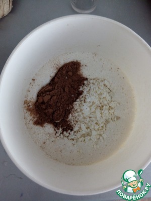 К яйцам добавляем творог, какао-порошок и ванилин. Тщательно перемешиваем.