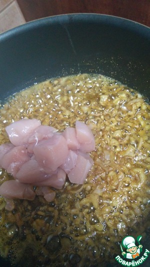 Мелко режем луковицу, нарезаем курицу на небольшие курочки (2 см примерно).