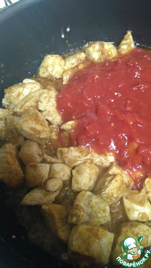 В обжаренную курицу добавляем помидоры. Если помидоры очень мясистые, и жидкости мало, добавляем четверть стакана воды. Оставляем для закипеть и немножко увариться (3-4 минуты)