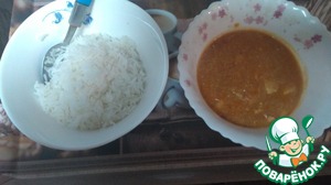 В идеале, соуса должно получиться очень много. Поэтому блюдо подается в двух тарелках - в одной курица в душистом соусе, во второй рис, чтобы каждый смог отрегулировать количество соуса в рисе.