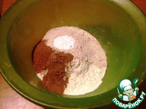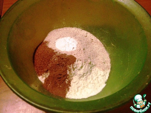 Смешать пшеничную и цельнозерновую муку, разрыхлитель, корицу и мускатный орех.
