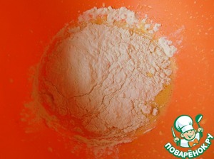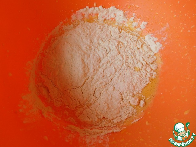 В отдельной посуде взбить желтки с молоком и лимонным соком (сока 60 мл. + 60 мл. воды). Добавить муку.