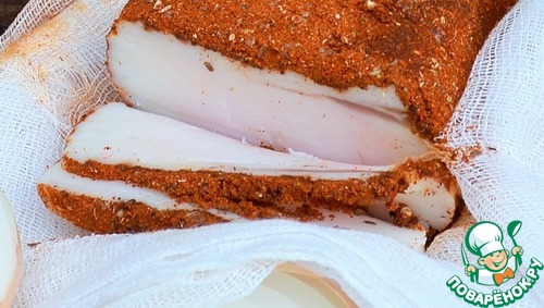 Затем на марле в 4 слоя обсыпать сало перцовой смесью.