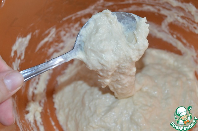 Подошедшее тесто не перемешивать! Оно чуть гуще, чем для оладий. Но не настолько густое, чтобы месить руками.