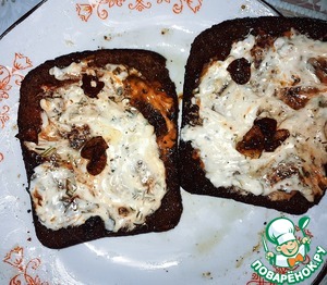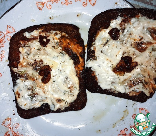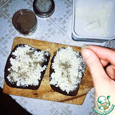 А тем временем, пока жарятся котлетки, намазываем Фету на наши гренки, и сверху присыпаваем перцем