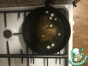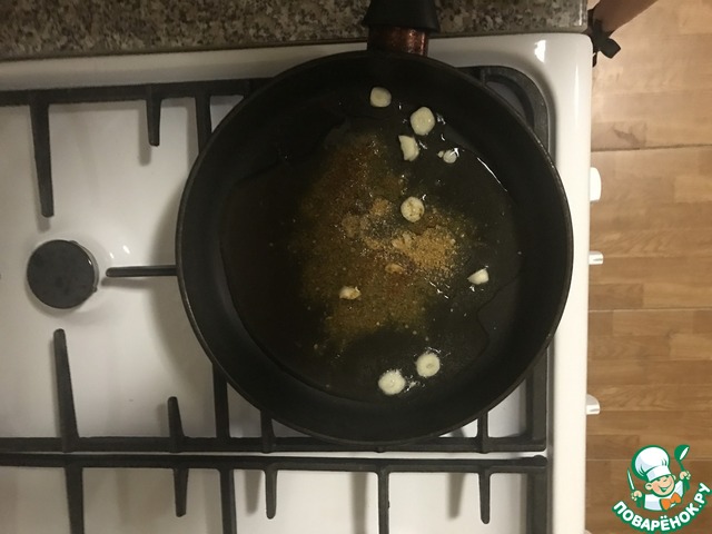 Раскалим масло на сковородке, добавляем чеснок, приправу для шашлыка, чуть соли и перца. Люблю добавлять в масло чеснок, добавляет аромат и насыщенность. Если на медленном или умеренном огне, то ничего не сгорит.