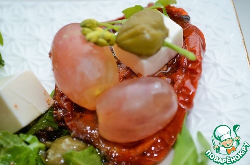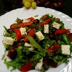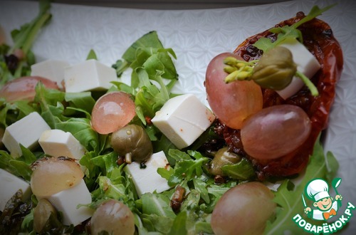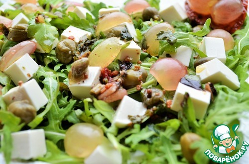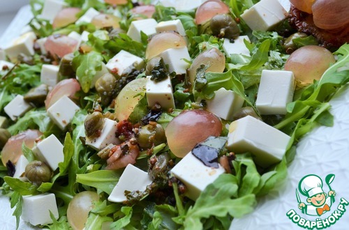 Руккола, сыр фета, каперсы и виноград собираются в классный салат. Очень свежо и пикантно, разнообразит и украсит Ваш праздничный стол. Рекомендую.