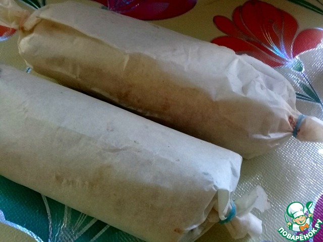 Аналогично приготовить второй рулет. Завернуть рулеты в бумагу для выпечки и поставить в холодильник на 1 час. -