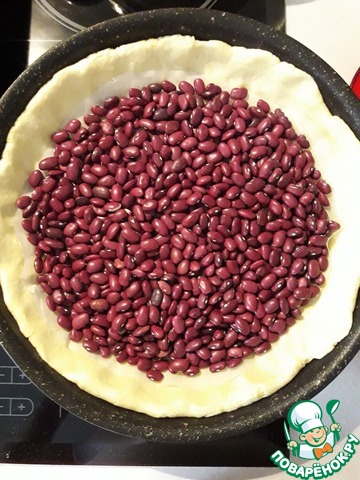 На сырое тесто сверху укладываем пергамент, на котором будет фасоль (для варки) для утяжеления (чтобы тесто не поднималось при предварительном запекании).