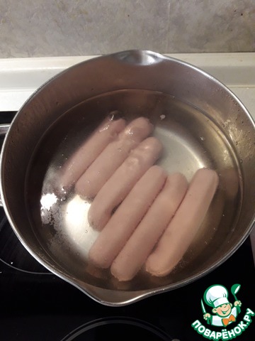 Сосиски отварить в кипящей воде 5-6 минут.