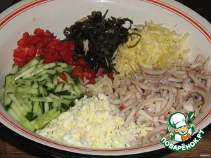 Кальмары почистить, отварить 3 минуты. Яйца отварить. Кальмары, огурцы порезать соломкой. Сыр, яйца потереть на крупной терке. Перец мелко порезать, чеснок натереть на мелкой терке или мелко порубить.