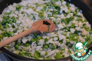 Добавить зеленый горошек, мелко нарезанный зеленый лук и чеснок. Перемешать. Добавить тимьян.