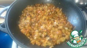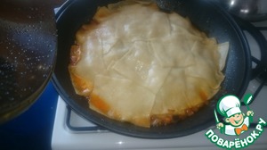 И выкладываем их равномерно на наше обжаренное рагу. По краешку вливаем стакан или полтора воды, ставим на медленный огонь и ждём минут 30 - 40. Как только тесто пропарится (приготовится) отключаем.