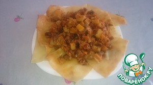 Подавать к столу нужно выложив на тарелку по краю квадратики теста, а сверху по центру наше рагу.