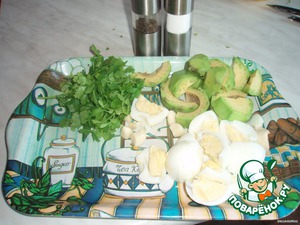 Авокадо, яйца чистим и режем на кусочки, чеснок (его количество зависит от того, насколько острое вы любите) разрезать пополам, зелень тоже порезать на несколько частей.