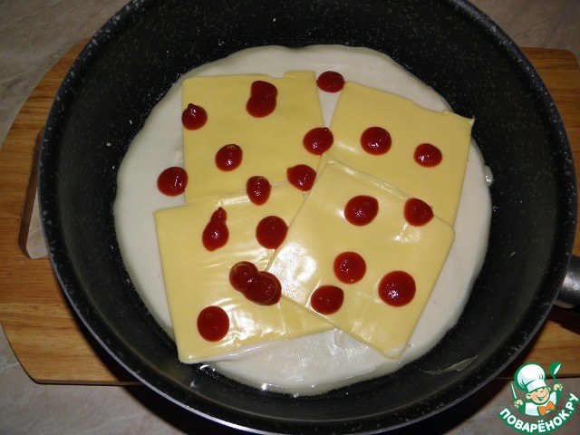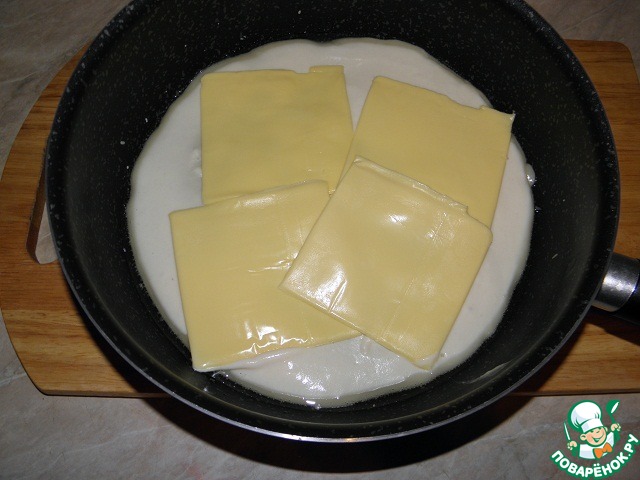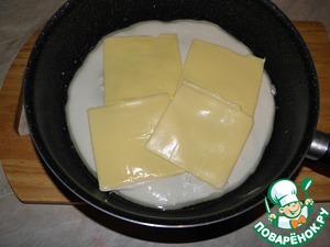 Когда тесто вылили (выложили ложкой) выкладываем наверх пластинки плавленного сыра (где то половина пачки). -