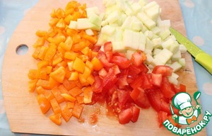 Кабачок, болгарский перец и 1 помидор нарезаем среднего размера кубиком, стараемся, чтобы все овощи были одинакового размера, петрушку мелко рубим.