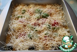 В форму для запекания складываем все овощи, разравниваем равномерно и заливаем яичной смесью, помидоры черри и маслины, нарезаем и выкладываем сверху, украшаем листьями базилика и тертым сыром по вкусу.