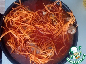 По истечении 15 минут в противень к мясу вводим томатно-чечевичную смесь и морковь натертую на терке.