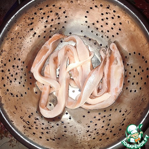 Нарезаем кальмар колечками, чистим мясо лосося от шкурки и режем.
