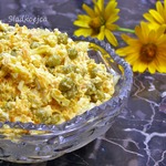 4. Морковь перекладываем в салатник, добавляем мясо, горошек (немного оставляем для украшения), замаринованный лук (слив лишнюю жидкость), яйца, перчим и солим по вкусу. Добавляем майонез. Перемешиваем.