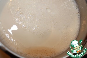 Тонкой струйкой вливаем желтковую массу в горячее (не кипящее) молоко и помешиваем.