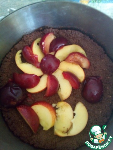 Далее на остывший корж, проявляя фантазию, выкладываем фрукты.