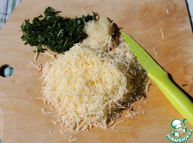 В пюре добавляем измельченный чеснок, сыр, соль и нарезанную зелень. Тщательно перемешиваем.