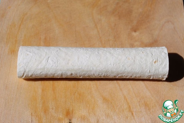 Берем лаваш, нарезаем на части, выкладываем начинку на край каждого прямоугольника.